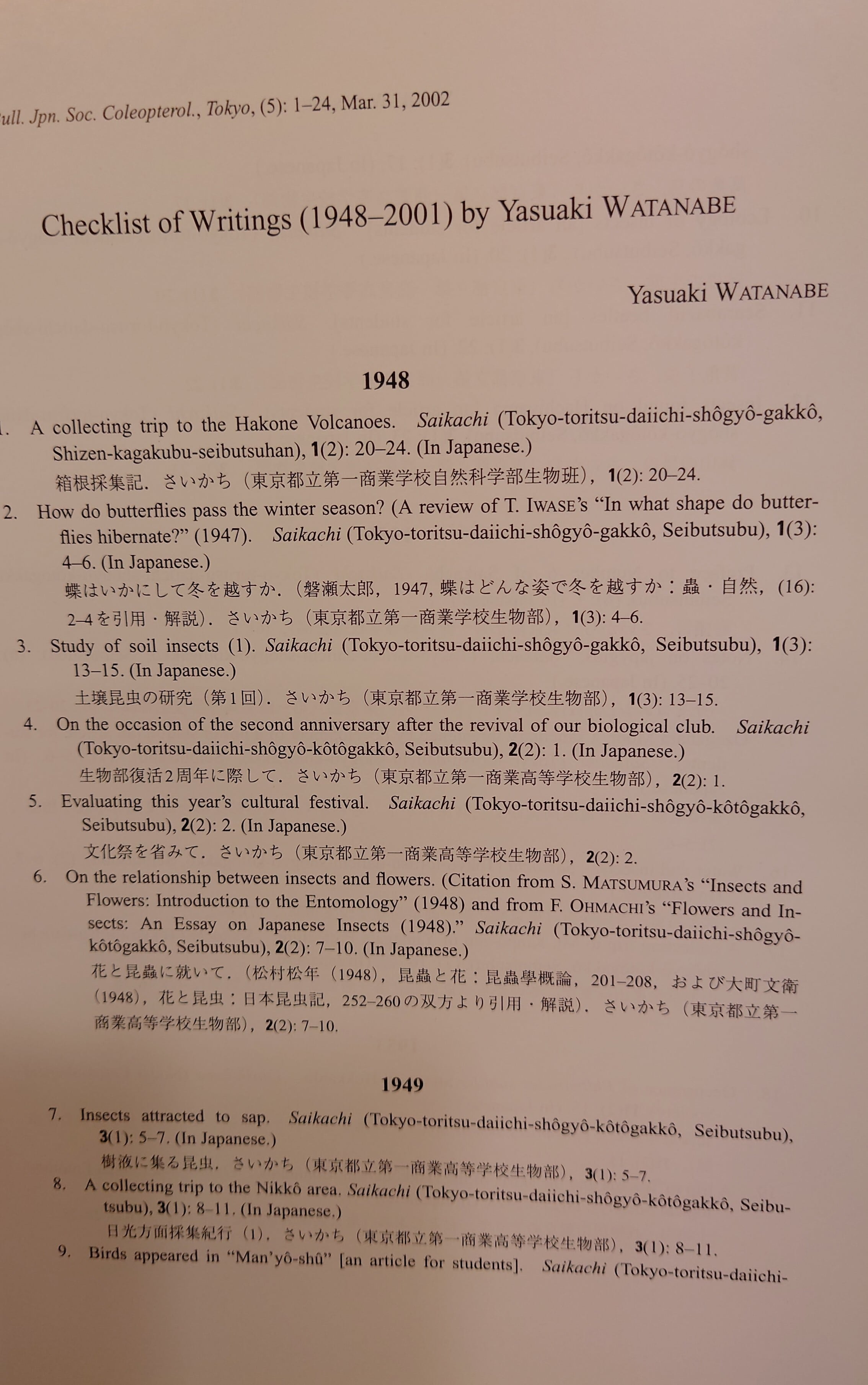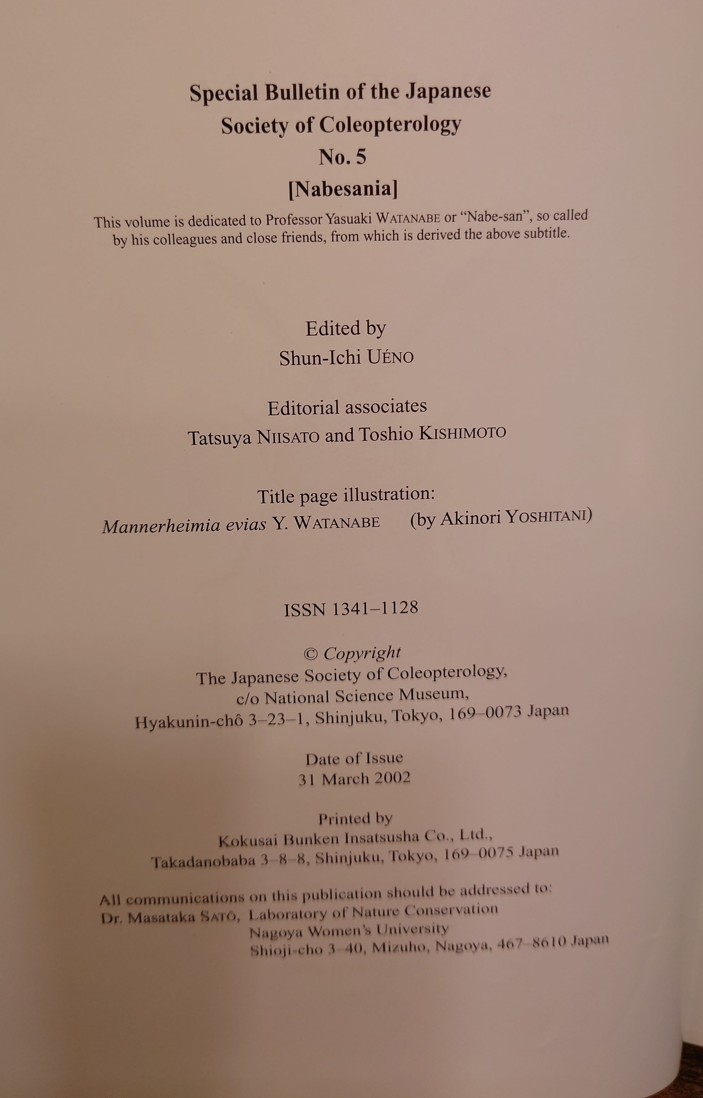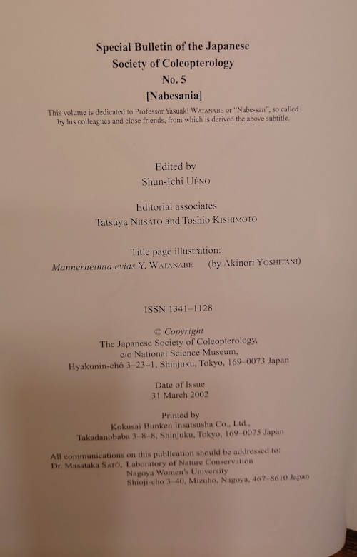 <古書>日本鞘翅目学会特別研究報告(渡辺泰明・退官記念号)/2002年/B5/493頁/英文 カバー、スレ、キズ、少ヤケ、色褪せ、少シミ。天地小口、少ヤケ、少シミ、少汚れ。本文、少ヤケ、周辺部少しヤケ強め。通読に支障はありません。古書感ご承知おきください。 管理番号M-生物、昆虫