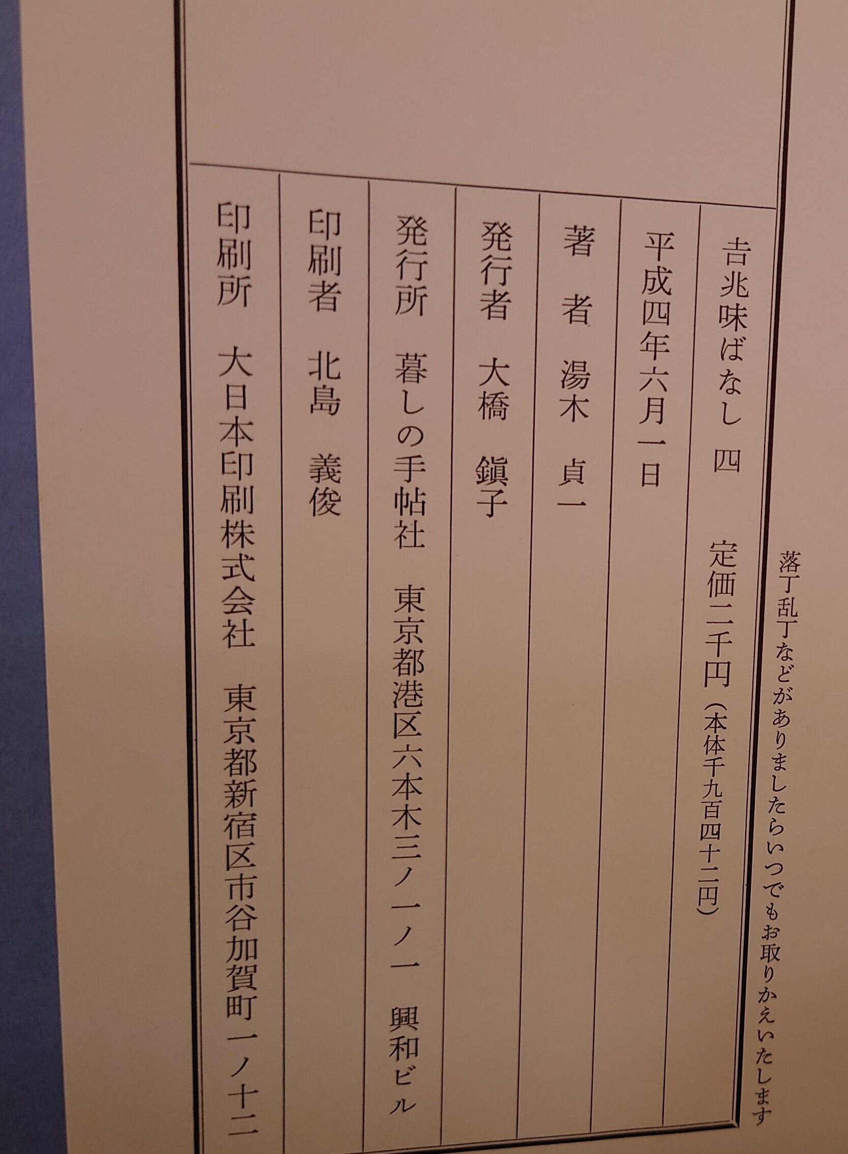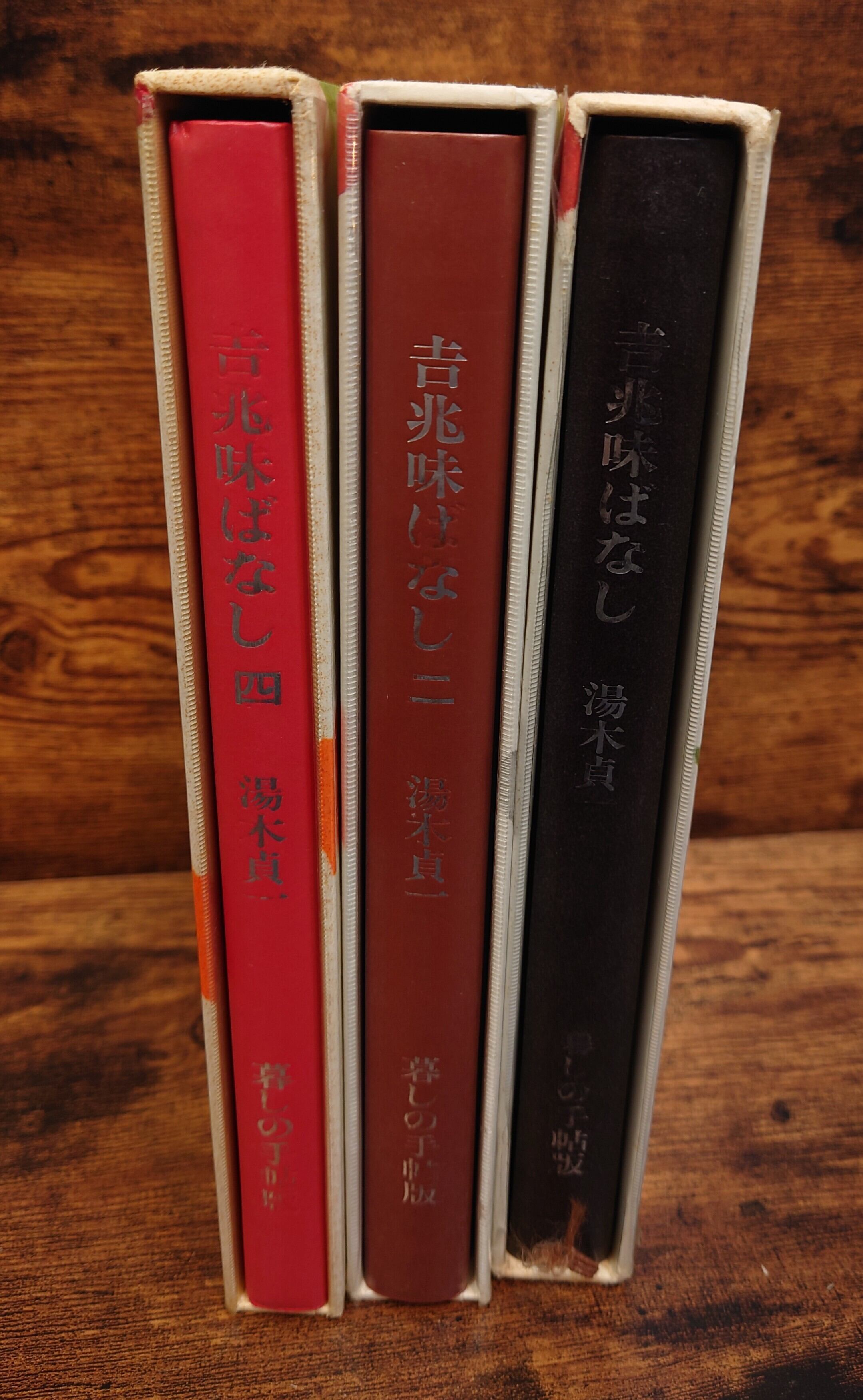 <古書>湯本貞一・著/暮しの手帖社/A5 1集・昭和57年2月1日/325頁 2集・平成2年7月17日/333頁 4集・平成4年6月1日/229頁 函ビニカバ、スレ、キズ、ヨレ、小ヤケ、一部破れ。函本体、ヤケ、シミ。本体カバー、無し。表紙、スレ、キズ、背の銀文字は少し擦れている部分あります。天地小口、小ヤケ、少シミ。本文、薄くヤケ。通読に支障はありません。帯無し。 管理番号M-食、セット