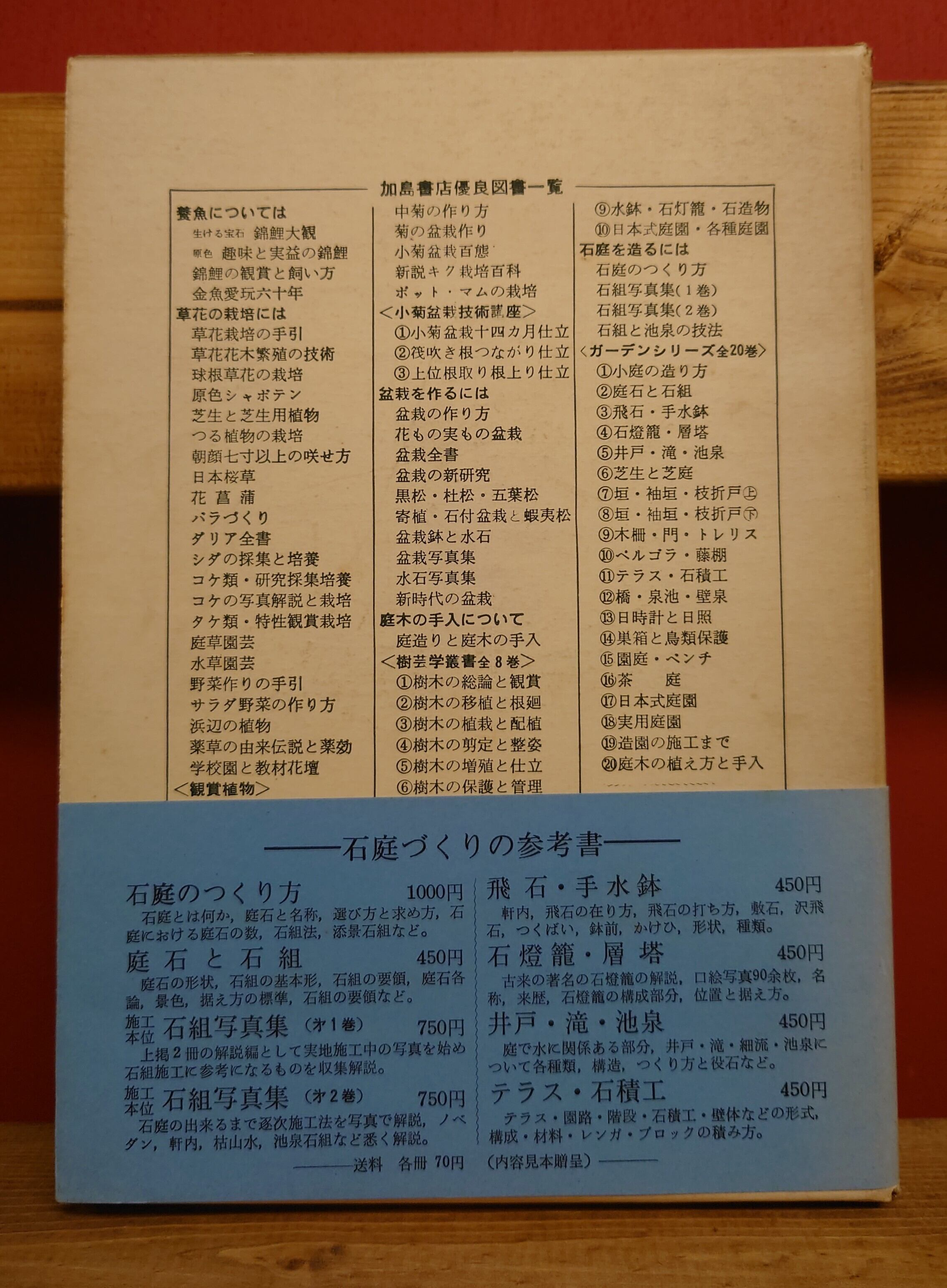 <古書>上原敬二・著/加島書店。昭和43年5月初版。函、ヤケ、シミ。本体ビニカバ、皺ヨレ。三方、ヤケ、シミ汚れ。本文、ヤケありますがおおむねきれいです。 造園のための、庭木の性質、移植、剪定、配置等について、広範に記述しています。巻頭は白黒写真ですが、日本のみならず世界で見てきた植栽の分析解説をしています。昭和43年の発行ですが、先進的な技法と理論を確立されていて、色褪せた感じがしません。造園に対する真摯な姿勢が伝わってきます。文章も読みやすいです。