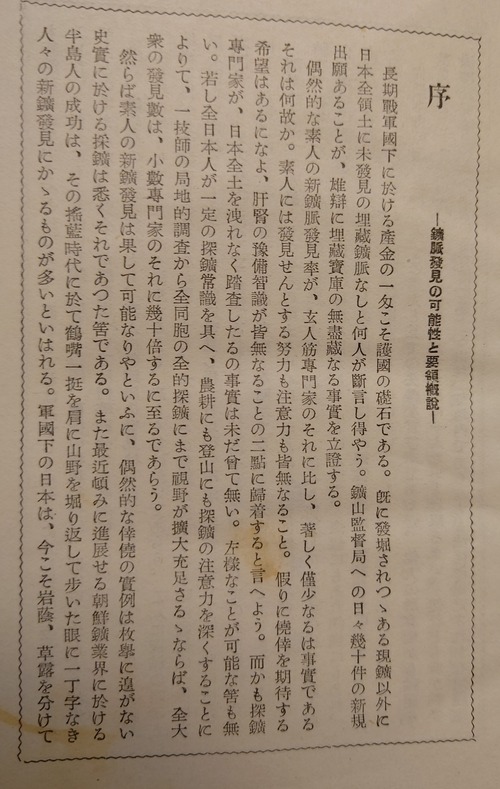 昭和13年、軍国主義につき進む日本。戦争の影も見え始めていたのでしょう。持続的な戦闘を維持するために資源の確保が急務。専門家でなくても、鉱脈は発見できる!と素人手引を作るということは、資源の枯渇は目に見えていたのでしょう。