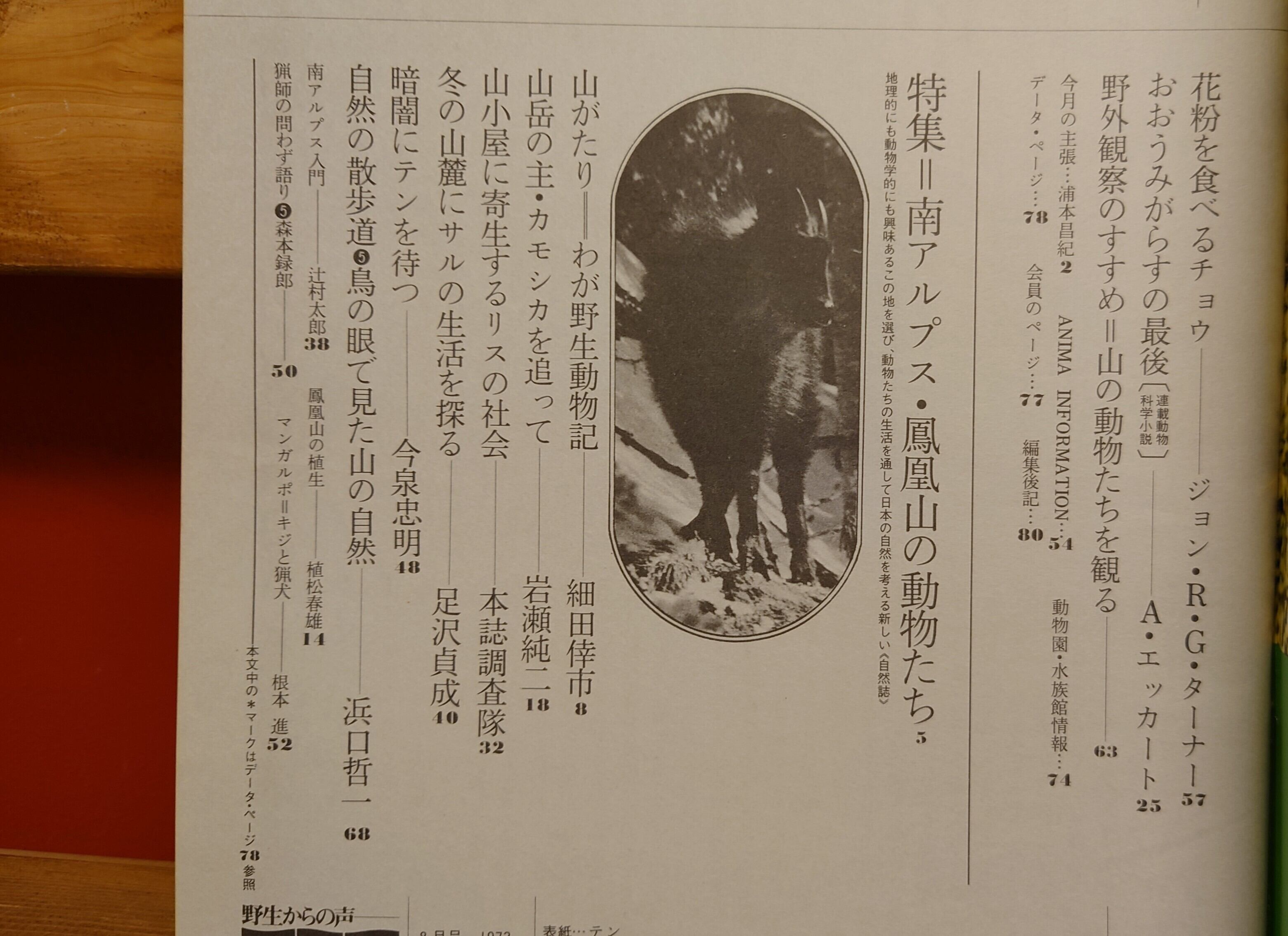 <古書>野生からの声アニマ1973年8月号。通巻5号。今西錦司/中西悟堂/監修 平凡社 表紙、スレ、キズ、少ヨレ、薄くヤケ。本文、薄くヤケありますがおおむねきれいです。 特集は南アルプス・鳳凰山の動物たち。 他に花粉を食べる蝶ー毒蝶の擬態など。