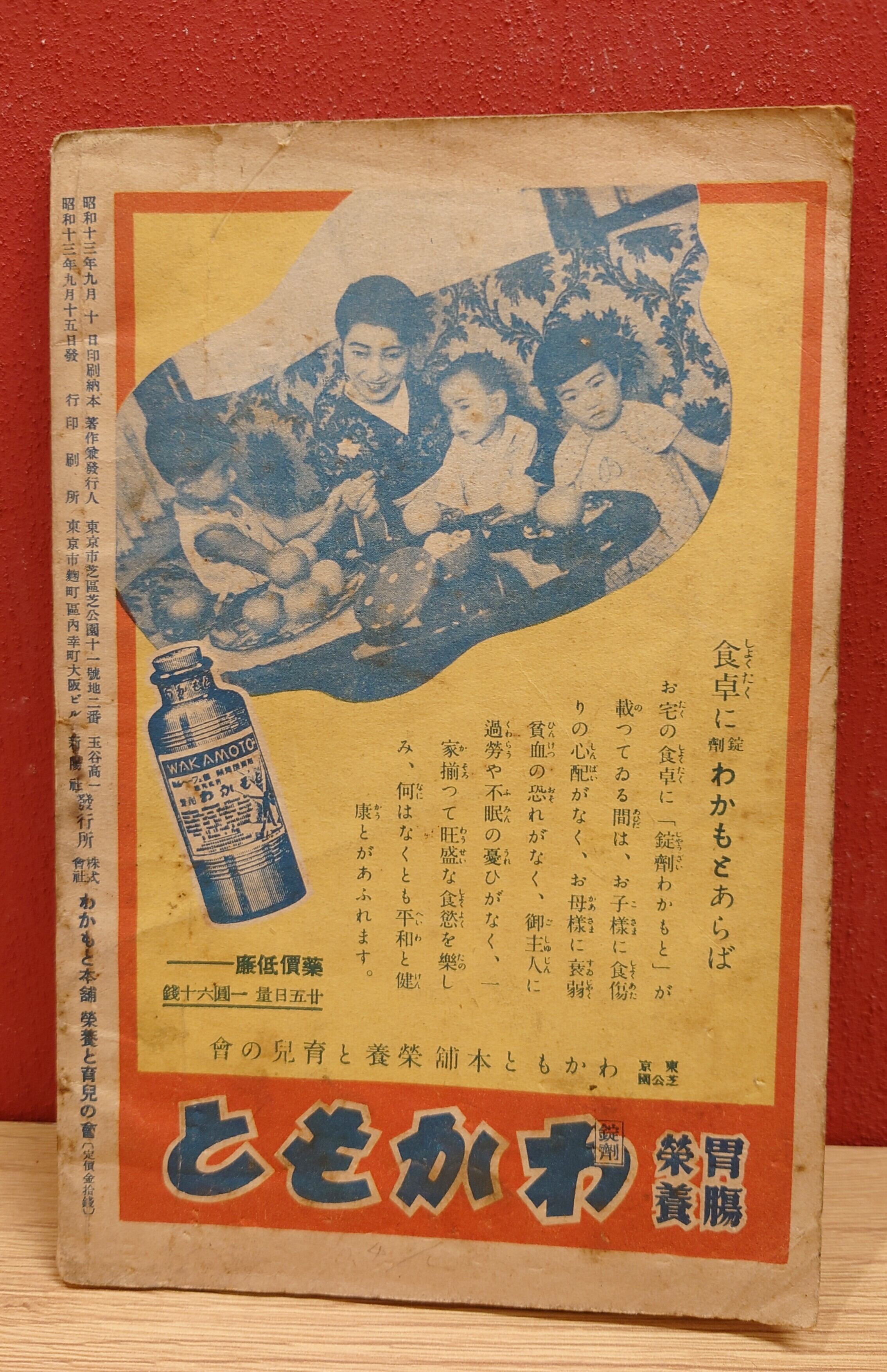 <古書>わかもと本舗 栄養と育児の会/昭和13年9月発行/長岡規矩雄・玉谷高一・長谷川露二・著 表紙、ヤケ、シミ、汚れ強いです。本文、ヤケシミ、一部濡れシミあります。画像参照ください。紙質、経年劣化あります。 <覚えて置くと一生得する 重宝秘訣絵本) 胃腸薬錠・わかもと本舗が制作した、生活に役立つ情報冊子。昭和13年ということで、すでに戦争の足音が感じられる部分もあります。(眼で距離を判定する標準の頁)