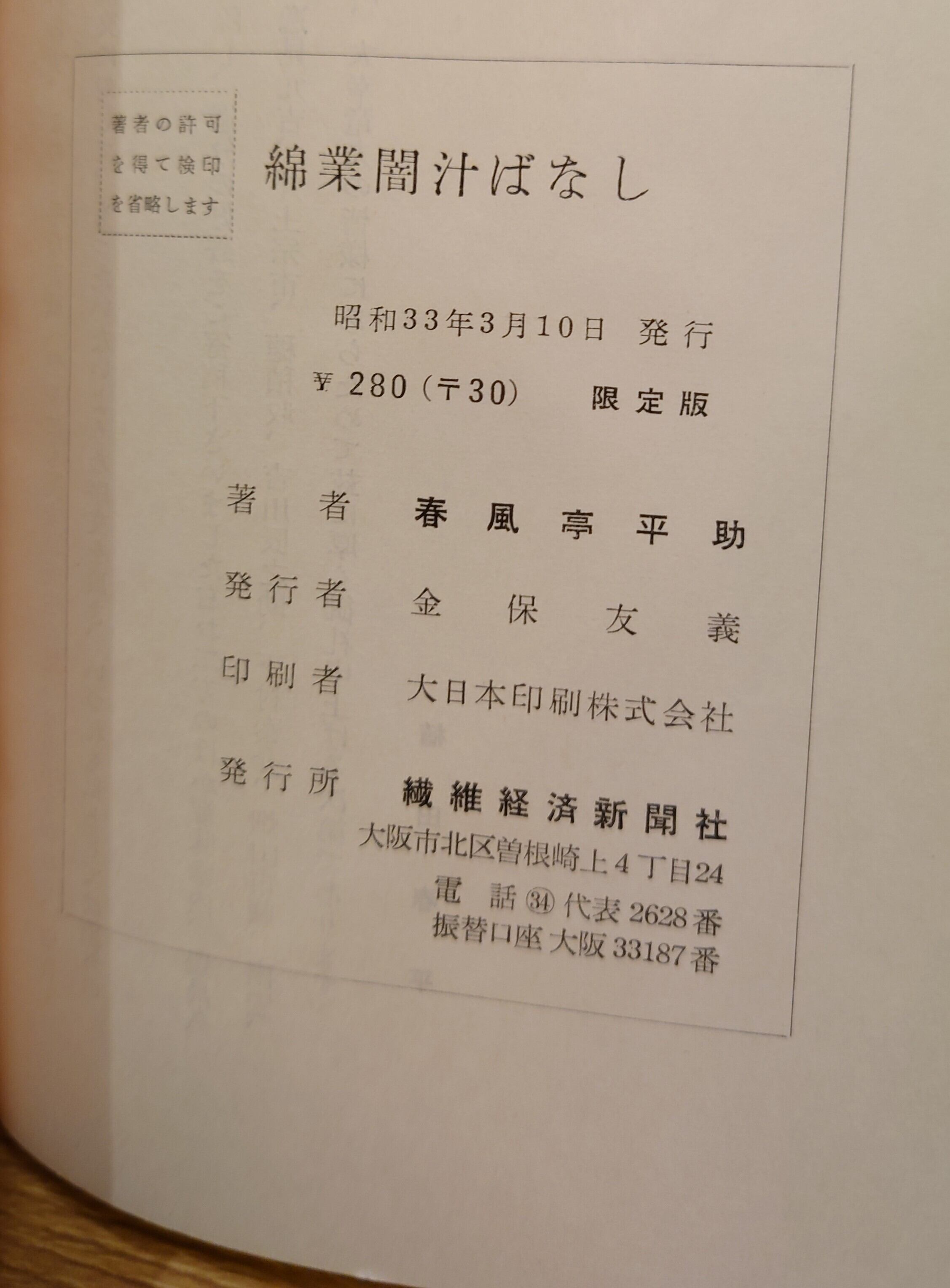 <古書>春風亭平助(植田春平)・著/繊維経済新聞社/昭和33年3月/B6版/275頁。