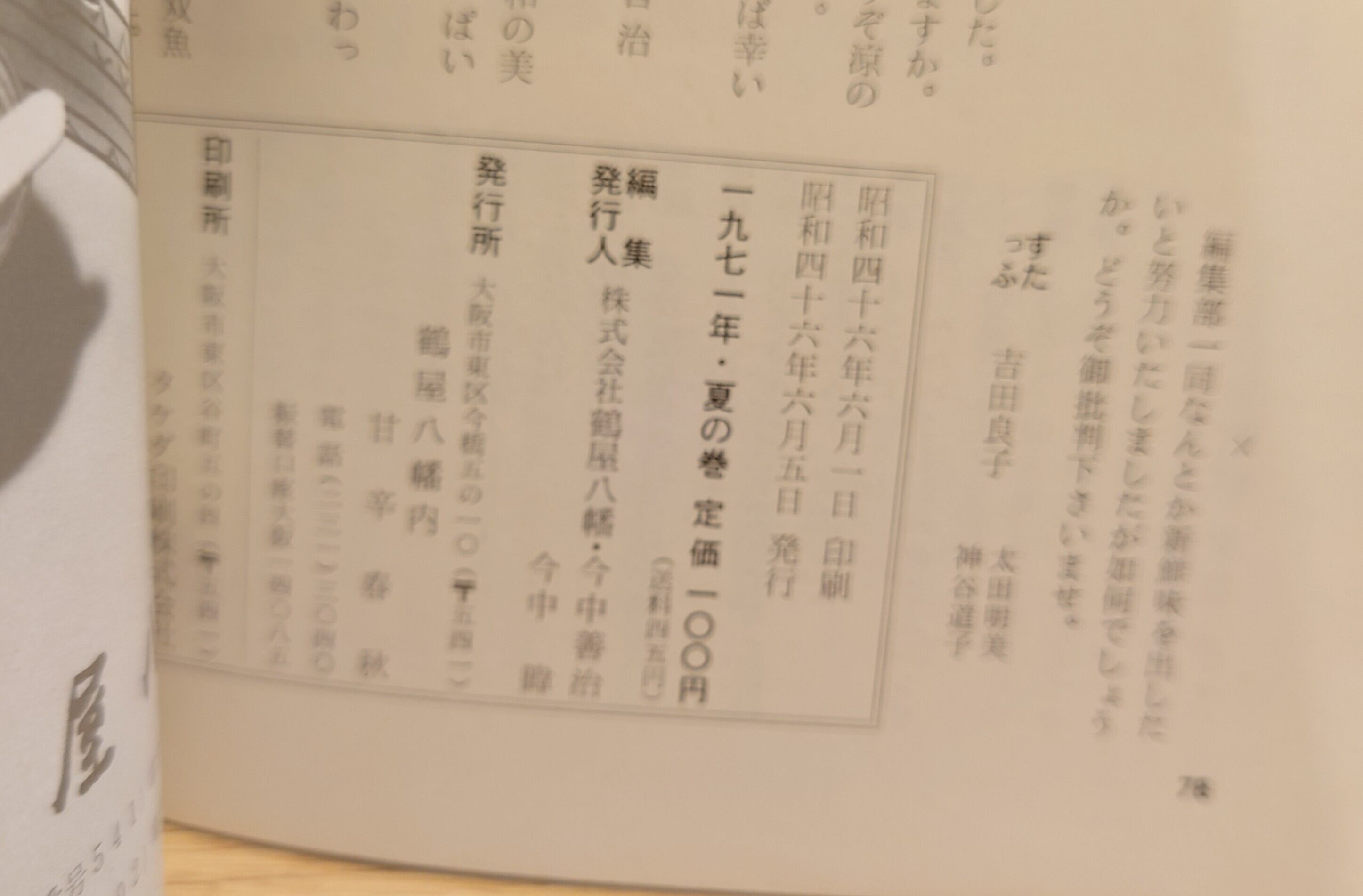 <古書>鶴屋八幡/昭和46年6月5日発行/B6/78頁 表紙、スレ、キズ、少ヨレ、少ヤケ、僅かにシミ。天地小口、ヤケ。本文、少ヤケ、下角が折れ気味です。通読に支障はありません。古書感ご承知おきください。 御菓子司・鶴屋八幡の発行 食、民俗、民芸、紀行、歴史、芸能など、寄稿を編集。 執筆陣が豪華。 管理番号M-平